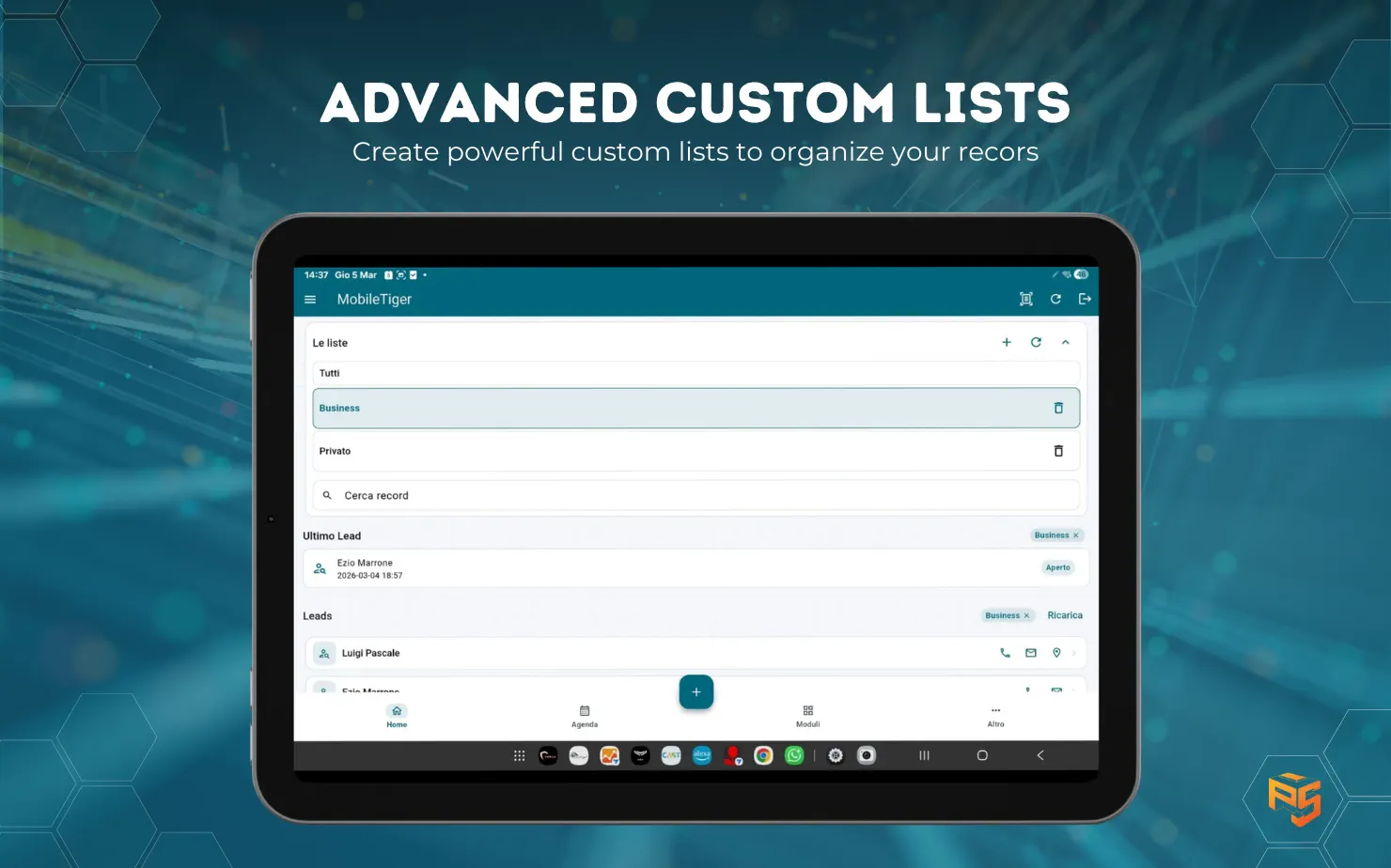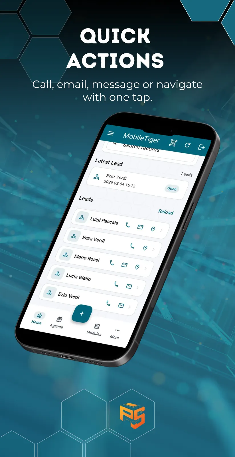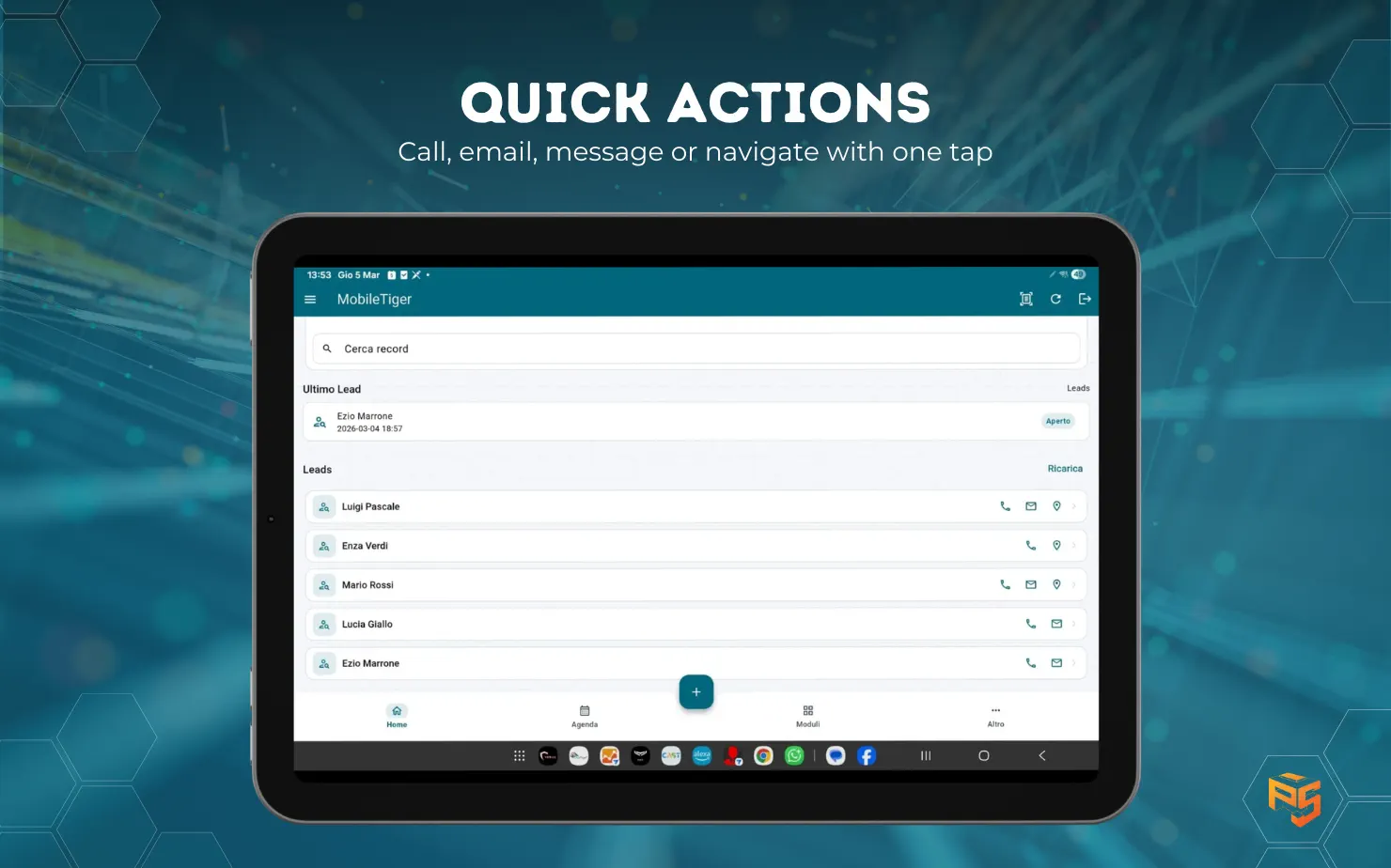 Si: visualizzazione, ricerca, creazione, modifica e cancellazione record, oltre ad agenda e quick actions.